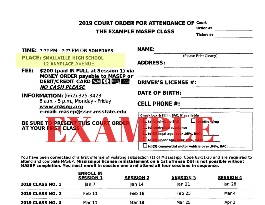 If the individual is licensed with Mississippi and received the 1st offense DUI in Mississippi, he/she must attend MASEP. If the individual is licensed with Mississippi and received the DUI in another state, he/she must contact the MASEP office at 662-325-3423 and REQUEST APPROVAL to take an out of state class. There will be an out of State Processing Fee if you take a class in a different state. After completion of the class he/she must send a copy of his/her program completion certificate to MASEP. The Operations Coordinator will determine if the program attended is a comparable program to MASEP and will approve the out of state program in place of MASEP if it is. We strongly suggest that you also send a copy of your completion certificate to the court that handled your case.